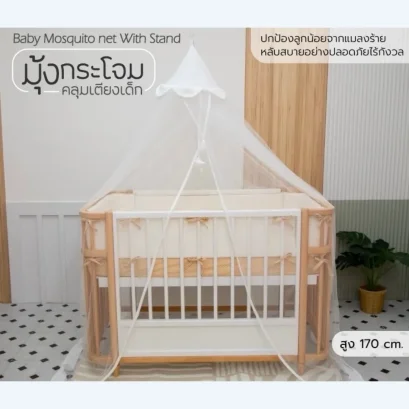 มุ้งเตียงเด็กทรงกระโจม สีขาว ปรับความสูงได้ คลุมถึงพื้น กันยุงแมลง ใช้ได้กับทุกเตียง พร้อมโมบายพระจันทร์ดาว