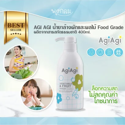 ล้างผักผลไม้ให้สะอาดปลอดภัย ไม่เสียรสชาติ ยืดอายุให้เก็บได้นาน ไม่มีสารตกค้าง กำจัดจุลินทรีย์ เชื้อรา สิ่งสกปรกและแว็กซ์เคลือบผลไม้ Agi Agi Vegetable & Fruit Wash ผลิตจากสารสกัดธรรมชาติ เป็น Food Grade