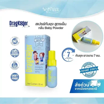 กลิ่นหอมเย็นสบาย Baby Powder ป้องกันยุงได้นาน 7 ชม. ปราศจาก DEET และ Paraben ใช้ได้ทั้งครอบครัว เด็ก 4 ปีขึ้นไปก็ใช้ได้ ขนาดพกพา 30 กรัม