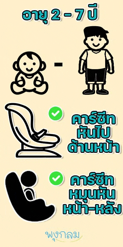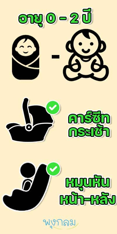 ** ขอเน้นว่าลูกถ้าลูกยังอายุไม่ถึง 2 ขวบต้องนั่งในคาร์ซีทแบบหันหลังให้คนขับเท่านั้นนะคะ เพราะกระดูกคอและกระดูกสันหลังของลูกยังไม่แข็งแรงพอที่จะรับแรงกระแทก หรือ การเบรคแรงๆ ได้ เรื่องนี้สำคัญมากแนะนำคุณพ่อคุณแม่ให้ความสำคัญมากๆ และบอกกับทุกคนในบ้านให้เข้าใจ ไม่ให้อุ้มลูกอายุต่ำกว่า 2 ขวบในรถ ไม่ว่าจะเดินทางใกล้ไกลขนาดไหนก็ตามเพราะอุบัติเหตุเกิดขึ้นได้เสมอ