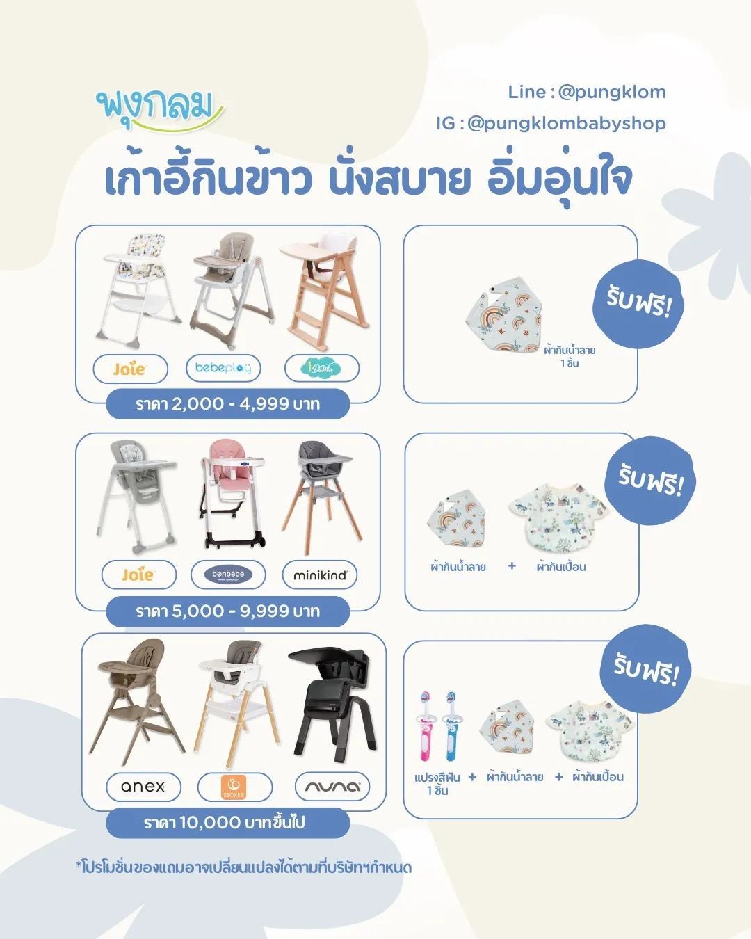 พับเล็ก พกพาง่าย มาพร้อมถุงใส่เก้าอี้สำหรับพกพาถาดใส่อาหารขนาดใหญ่ สามารถถอดออกล้างได้ ออกแบบมาเพื่อป้องกันการล้ม ฐานกว้าง และขากันลื่น สินค้ารับประกัน 6 เดือน