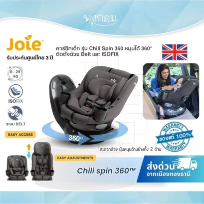 คาร์ซีท Joie Chili Spin 360 หมุนได้รอบทิศทาง ติดตั้งแน่นด้วยระบบ LockTight™ พร้อมบาร์กันดีดกลับ และที่วางแก้วในตัว รองรับน้ำหนักสูงสุด 29 กก.