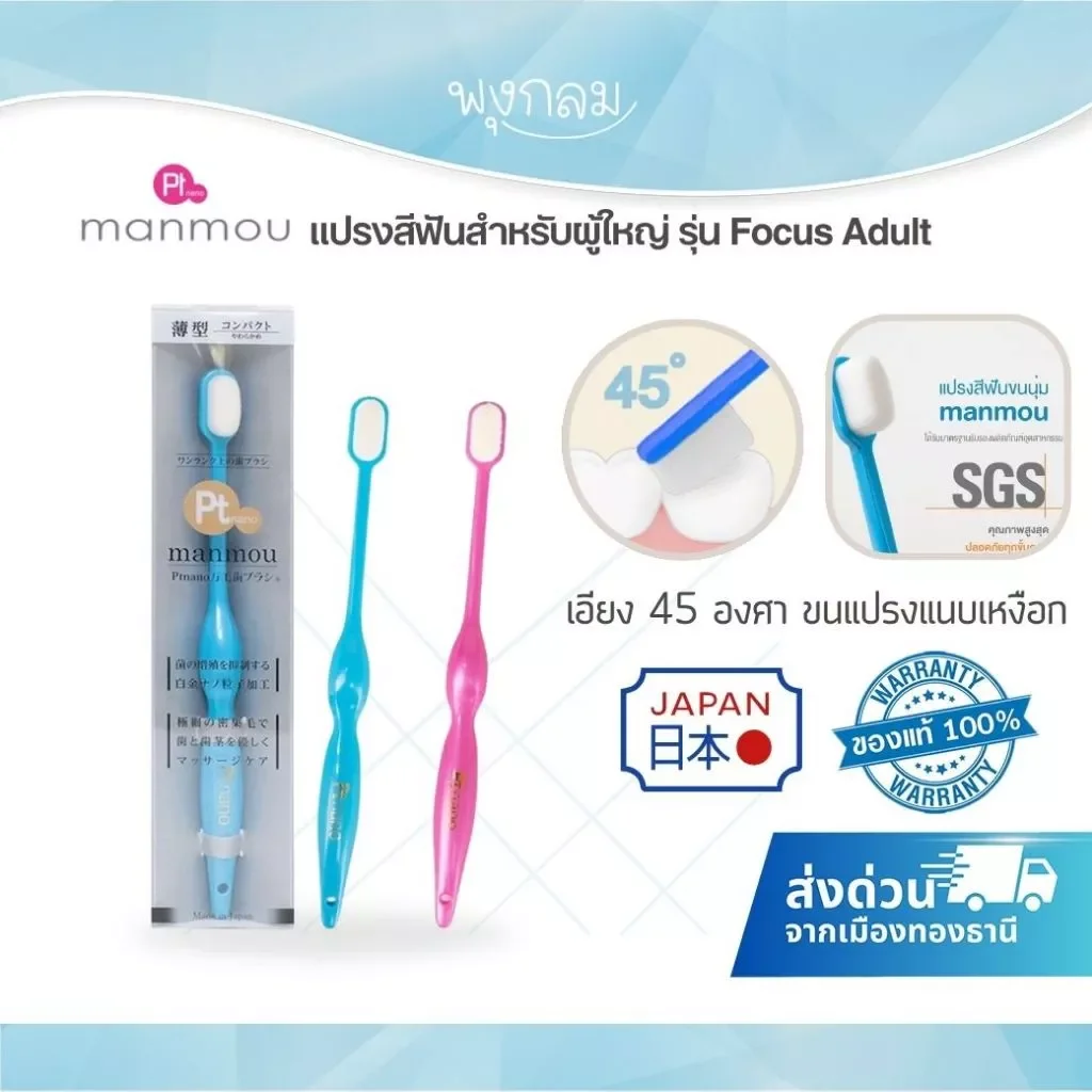 แปรงสีฟัน MANMOU Focus Adult พัฒนามาเพื่อการดูแลช่องปากที่เหนือกว่า ขนแปรงนุ่มพิเศษเพียง 0.08 มม. ไม่ทำร้ายเหงือก พร้อมเคลือบ Pt Nano ช่วยยับยั้งแบคทีเรียในช่องปาก ด้ามแปรงทรง 8 เหลี่ยมจับถนัดมือ ควบคุมการแปรงได้อย่างมั่นใจ