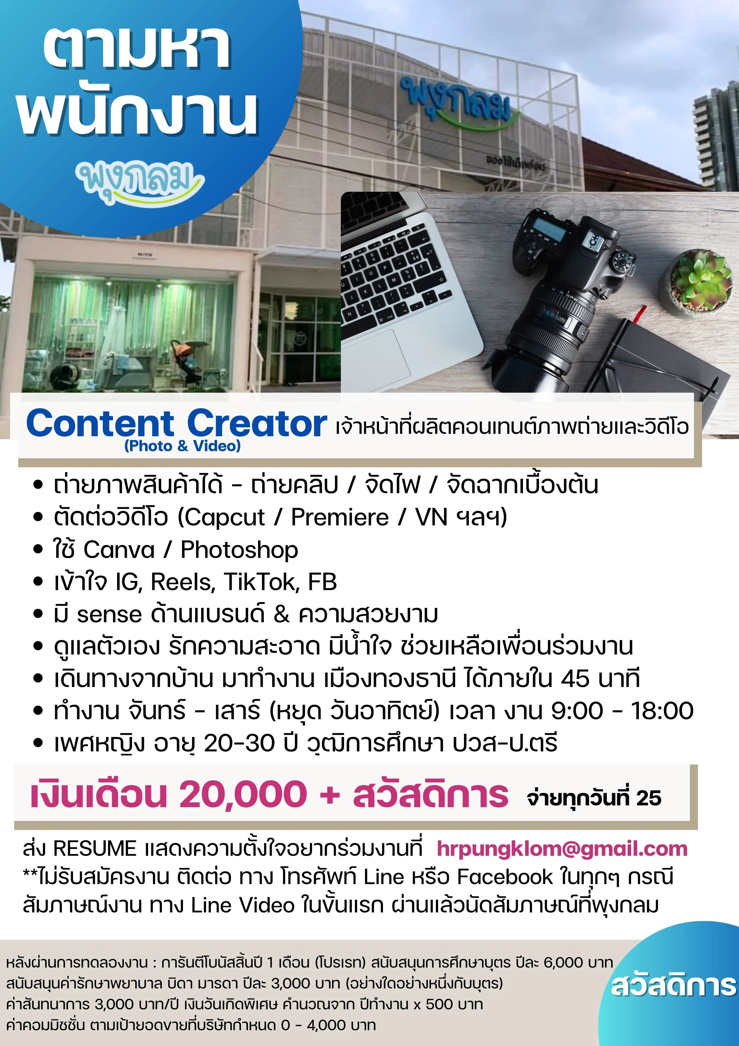 รับสมัคร พนักงานผลิตคอนเทนต์ภาพถ่ายและวิดีโอ (Full Time)