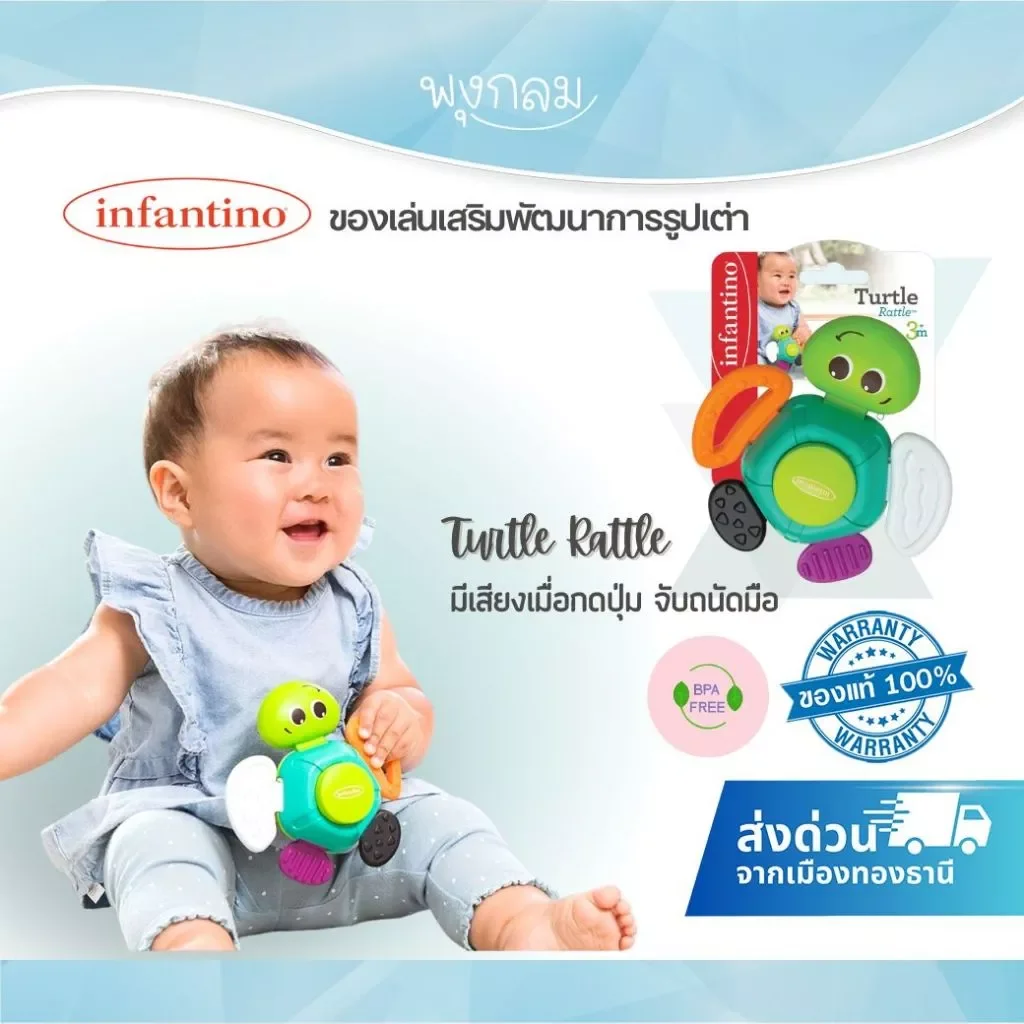 ของเล่นรูปเต่าสีสันสดใส ช่วยสร้างความสนุกสนานให้กับลูกน้อย เพียงกดปุ่มด้านหลังจะเกิดเสียง squeaky และเมื่อเขย่าจะมีเสียงกรุ๊งกริ๊ง พร้อมขยับส่วนขาเต่าได้ ช่วยกระตุ้นการเรียนรู้ผ่านการเล่น