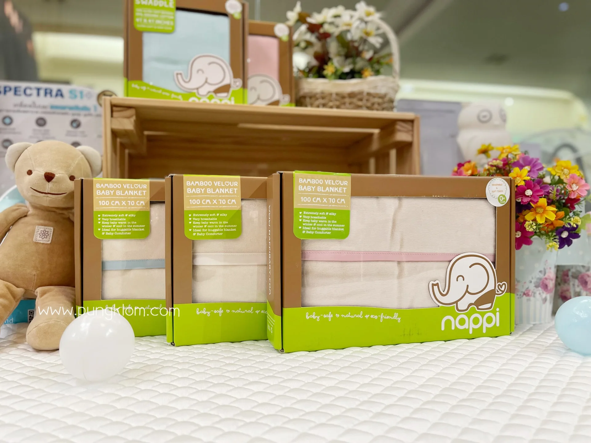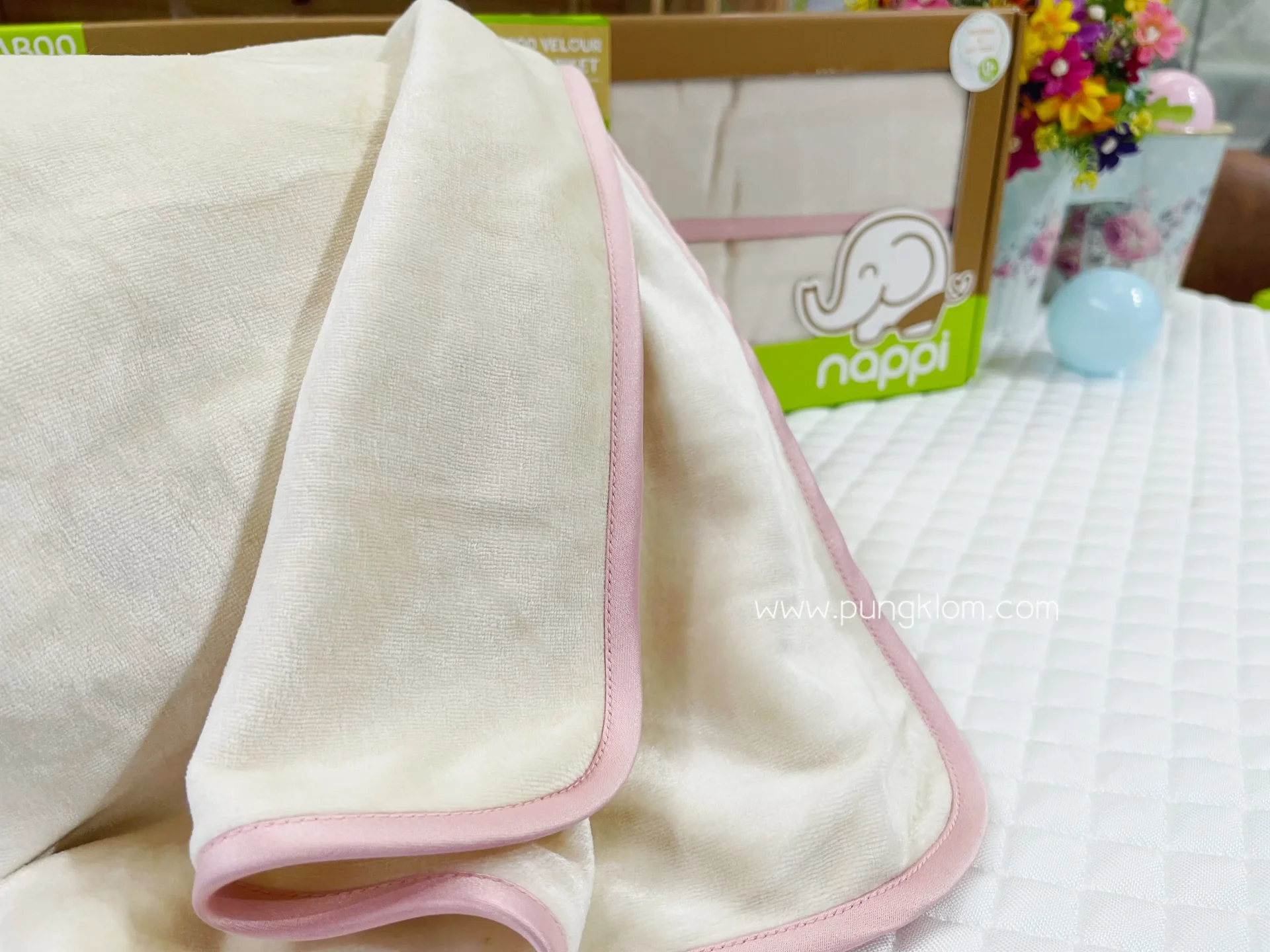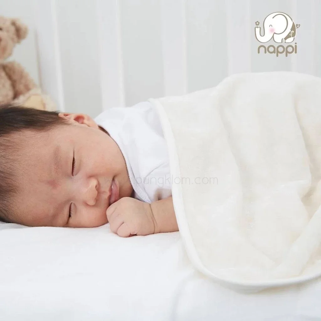 ผ้าห่มกันสะดุ้ง NAPPI ผลิตจากผ้าเวลัวเยื่อไผ่ประกบ 2 ชั้น ออกแบบให้มีน้ำหนัก 415 กรัม ซึ่งเป็นน้ำหนักที่เหมาะสำหรับเด็กแรกเกิด ช่วยให้ลูกรู้สึกเหมือนถูกกอด อบอุ่นและปลอดภัย