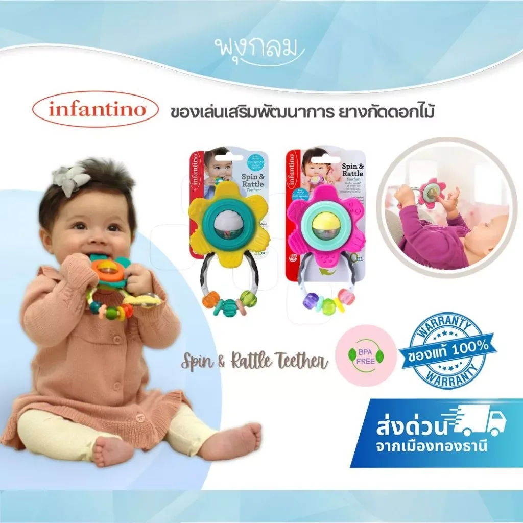 Infantino ของเล่นเสริมพัฒนาการยางกัดดอกไม้ Spin & Rattle Teether ออกแบบมาให้เป็นทั้งของเล่นเขย่าและยางกัดในชิ้นเดียว เหมาะสำหรับเด็กที่ฟันเริ่มขึ้น ช่วยลดอาการคันเหงือก พร้อมเสริมพัฒนาการรอบด้านอย่างปลอดภัย