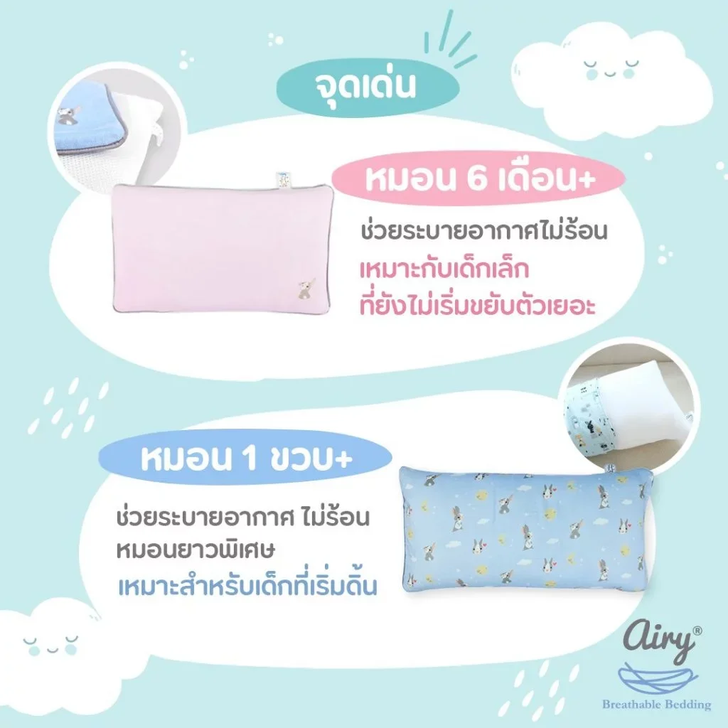 หมอนสำหรับเด็ก 1 ปีขึ้นไป ออกแบบให้ระบายอากาศได้ดี ลดการอับชื้นและเหงื่อสะสม ให้สัมผัสนุ่มสบายด้วยปลอกผ้ามัสลินใยไผ่ 100% ถอดซักได้ ดูแลรักษาง่าย เหมาะสำหรับการใช้งานทุกวัน
