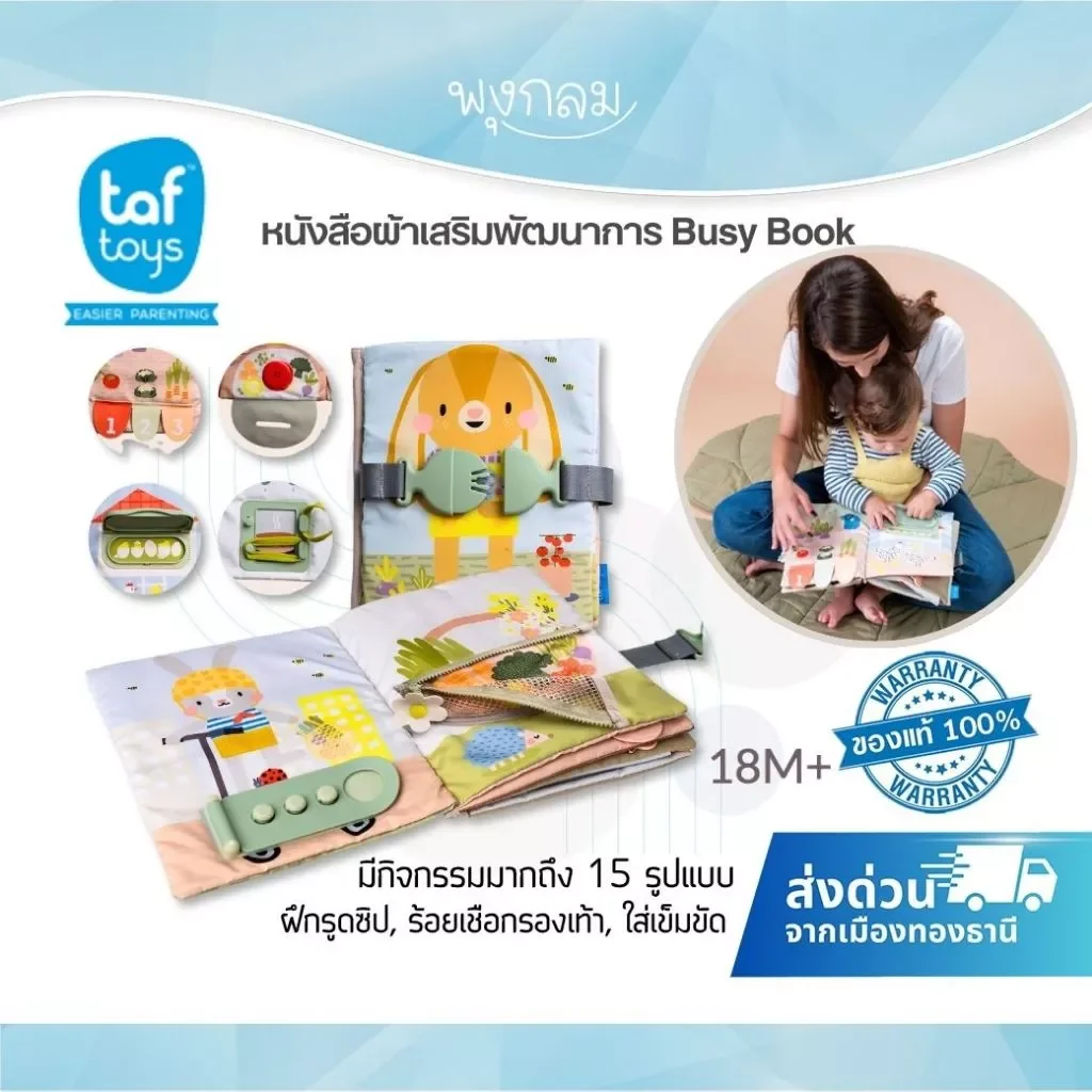 My 1st Busy Book จาก TAF TOYS คือหนังสือผ้าเสริมพัฒนาการ เพื่อกระตุ้นทักษะพื้นฐานที่สำคัญ ไม่ว่าจะเป็นการใช้มือ การแก้ปัญหา ความคิดสร้างสรรค์ และการเรียนรู้ทักษะในชีวิตประจำวันผ่านกิจกรรมที่หลากหลาย