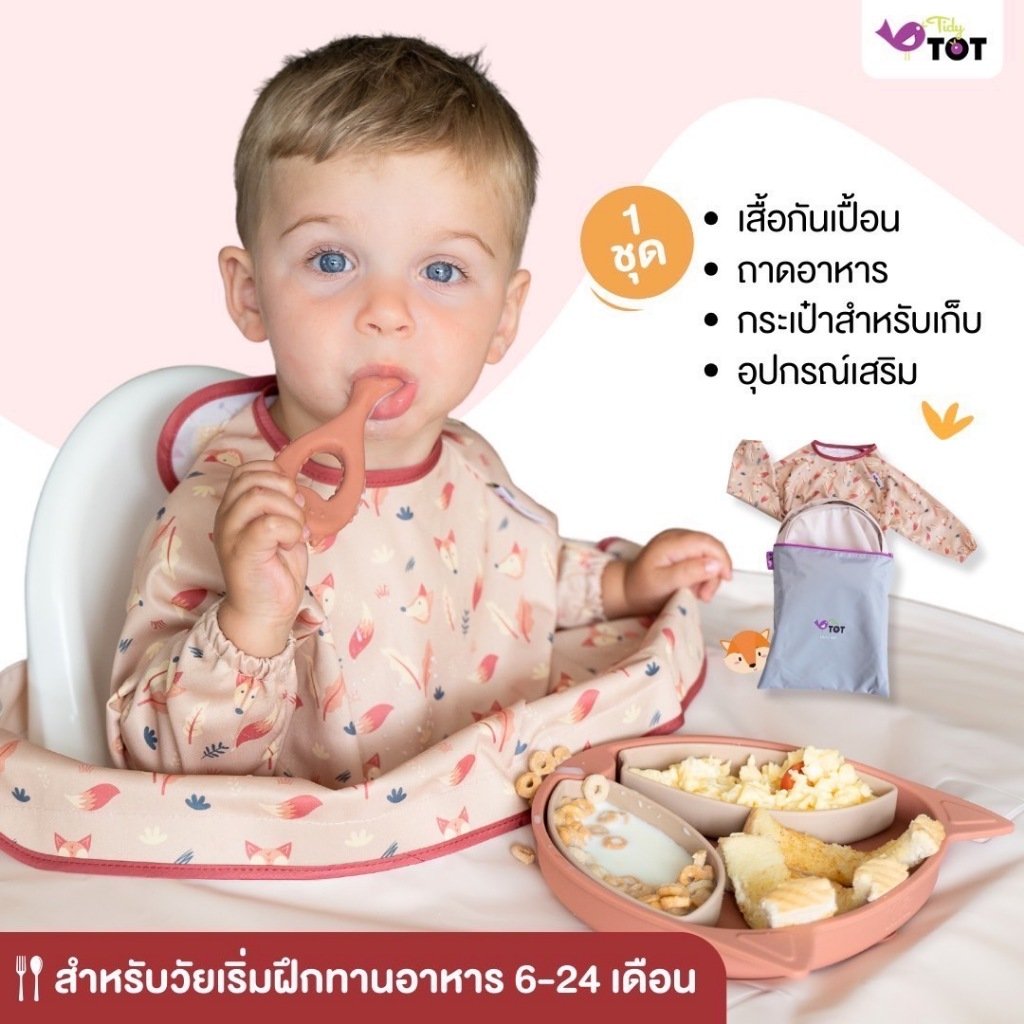 TIDY TOT Bib&Tray Set คือชุดผ้ากันเปื้อนพร้อมถาดกันเลอะสำหรับเด็ก เหมาะสำหรับเด็กวัย 6 เดือน 2 ปี ออกแบบมาเพื่อช่วยให้การหัดกินข้าวของลูกน้อยเป็นเรื่องสนุก สะอาด และปลอดภัย ถาดกว้างช่วยป้องกันอาหารหกเลอะเทอะ และวัสดุปลอดภัยตามมาตรฐานสากล เป็นอีกหนึ่งตัวช่วยที่คุณแม่ยุคใหม่ไว้วางใจเลือกใช้