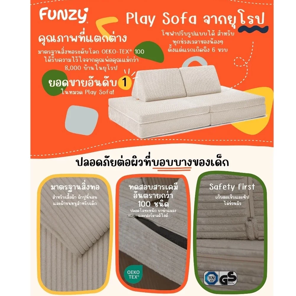 Funzy Kids Sofa โซฟาเล่นสำหรับเด็กอันดับ 1 จากยุโรป ที่ออกแบบมาเพื่อการเล่น การเรียนรู้ และการพักผ่อนในหนึ่งเดียว พร้อมมาตรฐานความปลอดภัยระดับโลก OEKO-TEX® Standard 100 มั่นใจได้ว่าเนื้อผ้าไม่มีสารเคมีอันตราย ปลอดภัยต่อผิวบอบบางของเด็ก ๆ