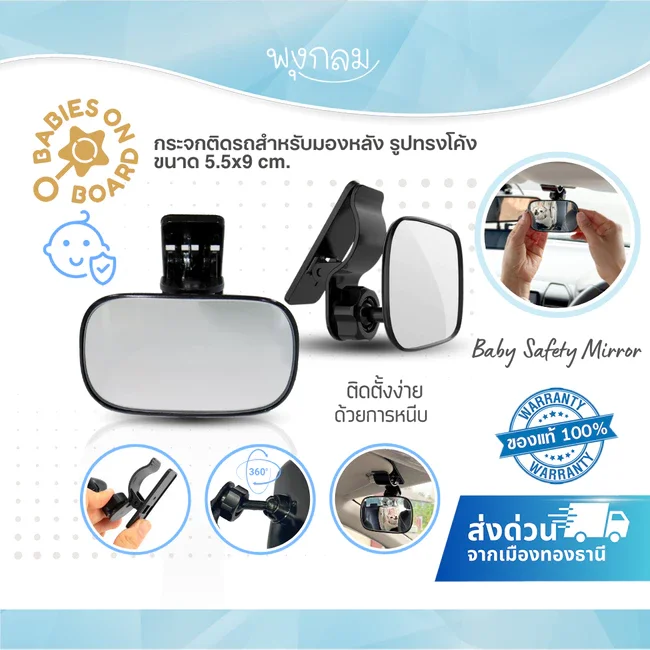 BABY SAFE MIRROR กระจกติดรถสำหรับใช้มองด้านหลัง เหมาะสำหรับคุณพ่อคุณแม่ที่ต้องการเช็กความปลอดภัยของลูกน้อยระหว่างเดินทาง ด้วยขนาดกะทัดรัด มองง่าย กระจกใส มุมมองกว้าง ช่วยให้เห็นภาพได้ชัดเจน พร้อมระบบหนีบติดตั้งง่ายไม่ยุ่งยาก