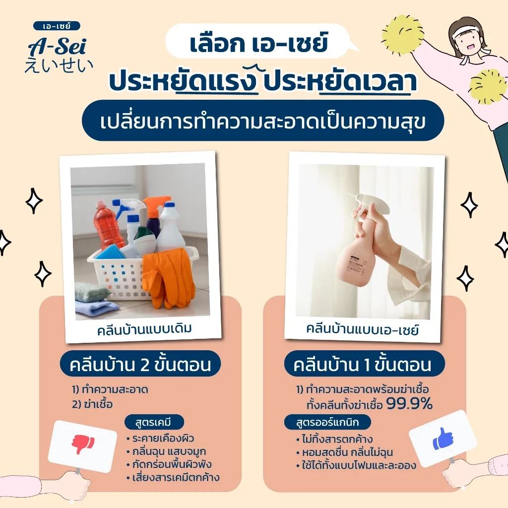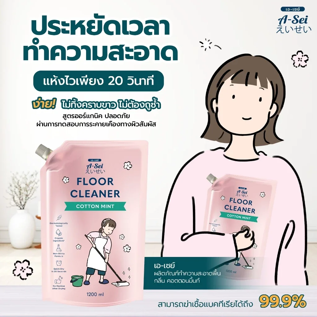 ให้การทำความสะอาดพื้นเป็นเรื่องง่ายและประหยัดเวลากว่าที่เคย A-Sei Floor Cleaner ผลิตภัณฑ์ทำความสะอาดพื้นสูตรออร์แกนิค ไม่เหนียวเหนอะหนะ ไม่ทิ้งคราบลื่น เดินสบาย ปลอดภัยสำหรับทุกคนในบ้าน