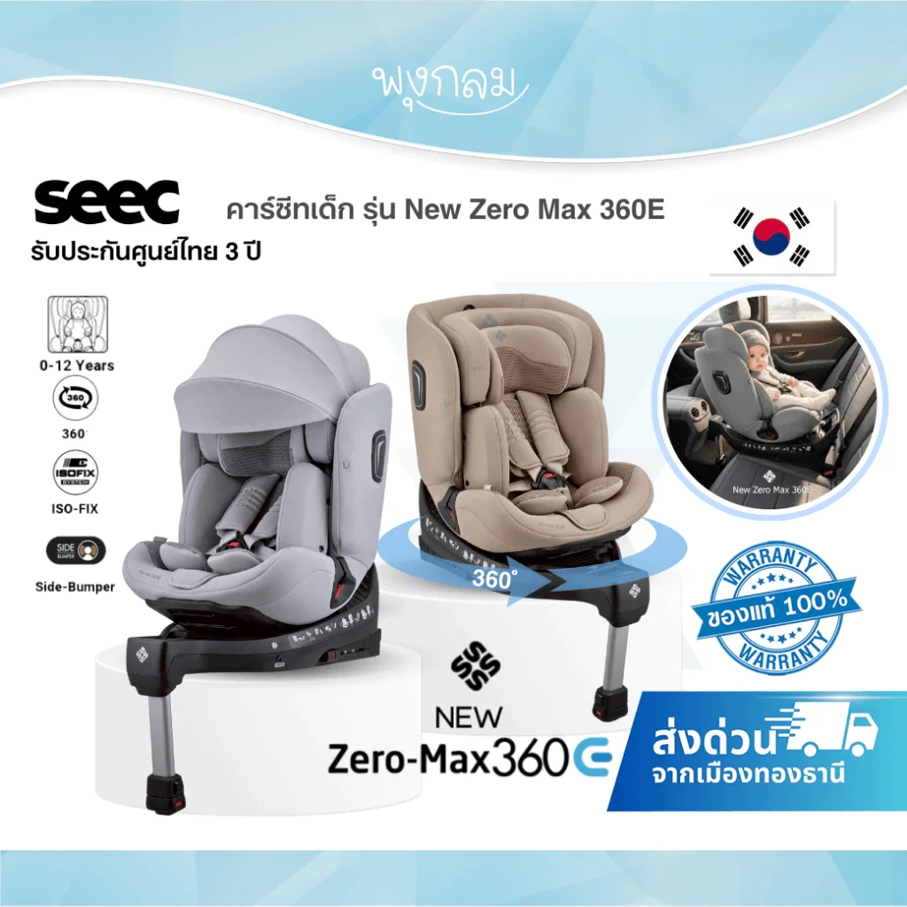 SEEC NEW ZERO MAX E คาร์ซีทหมุน 360° สำหรับเด็กแรกเกิด–12 ปี ระบบ ISO-FIX ซัพพอร์ต3D พร้อมหลังคาบังแดด