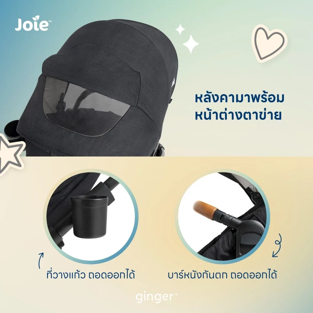 Joie Ginger รถเข็นเด็กดีไซน์พรีเมียม ออกแบบตามหลัก Anatomical Support รองรับสรีระลูกน้อยตั้งแต่แรกเกิด พร้อมระบบ pramette ที่สามารถปรับเป็น carry cot และเปลี่ยนเป็นที่นั่งได้โดยไม่ต้องยกเบาะออก ให้คุณกับลูกใกล้ชิดกันในทุกการเดินทาง
