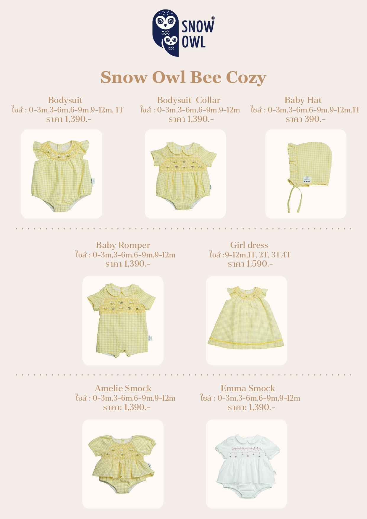 Bee Cozy Collection จาก Snow Owl มาพร้อมลายผึ้งสุดน่ารัก คุมโทนสีเหลืองอ่อนละมุน เหมาะสำหรับเด็กแรกเกิดและเด็กเล็ก ดีไซน์หลากหลายรูปแบบ ตอบโจทย์ทั้งใส่อยู่บ้าน ใส่ออกงาน หรือใส่ถ่ายรูป