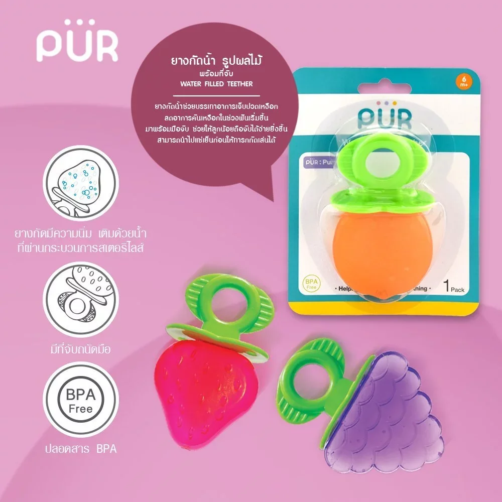 หมดกังวลเรื่องลูกน้อยงอแงช่วงฟันเริ่มขึ้นด้วย PUR Water Filled Teether ยางกัดน้ำดีไซน์รูปผลไม้สีสันสดใส ออกแบบมาเพื่อช่วยลดอาการคันเหงือกและนวดเหงือกอย่างอ่อนโยน พร้อมที่จับที่ออกแบบมาให้มือน้อยๆ ของลูกน้อยถือจับได้อย่างถนัดมือ