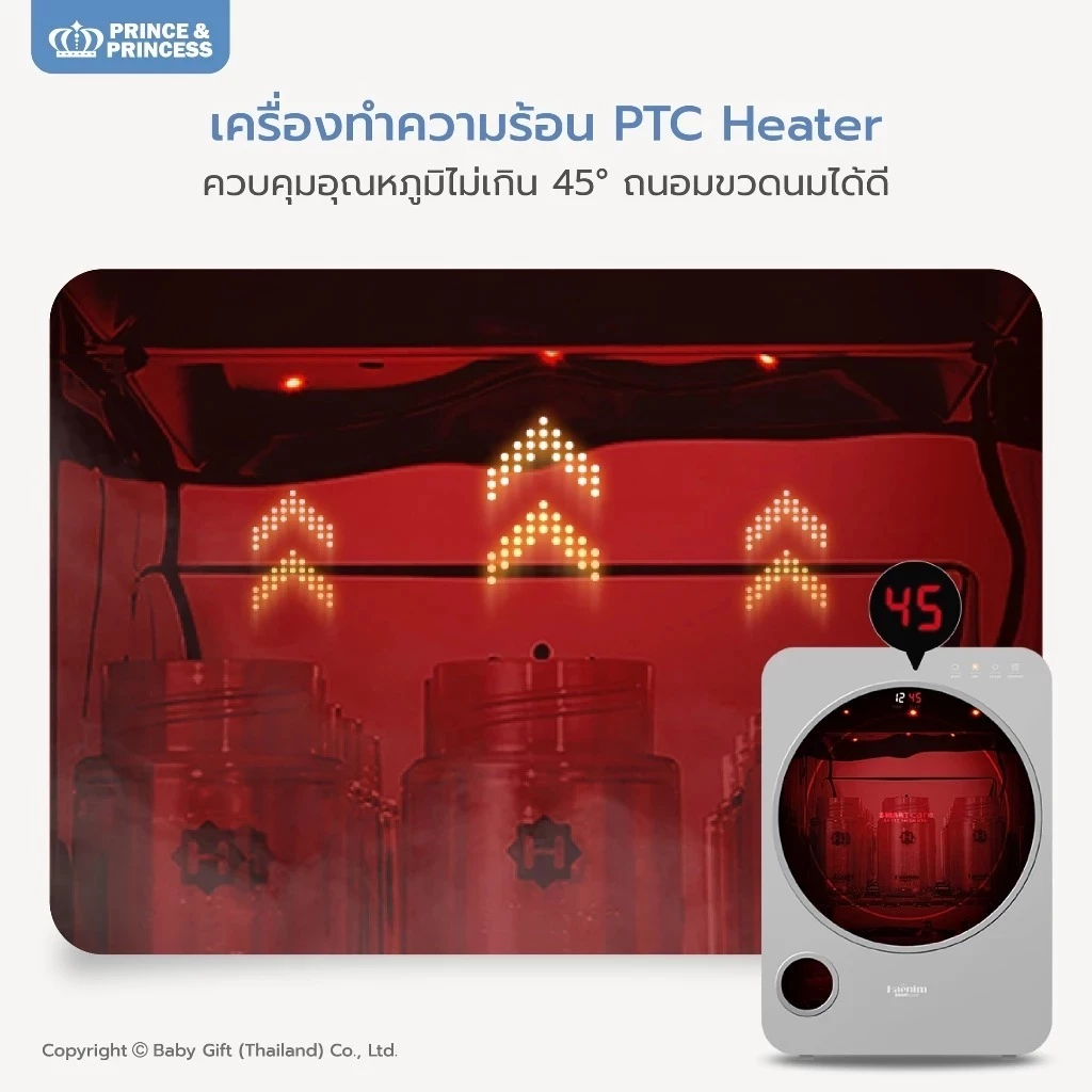 • Bottle Care 45°C: ใช้ PTC Heater ควบคุมอุณหภูมิความร้อนไม่เกิน 45 องศาเซลเซียส ช่วยถนอมพลาสติกและยืดอายุการใช้งานของขวดนม ไม่ให้ขุ่นมัวหรือเสื่อมสภาพไว