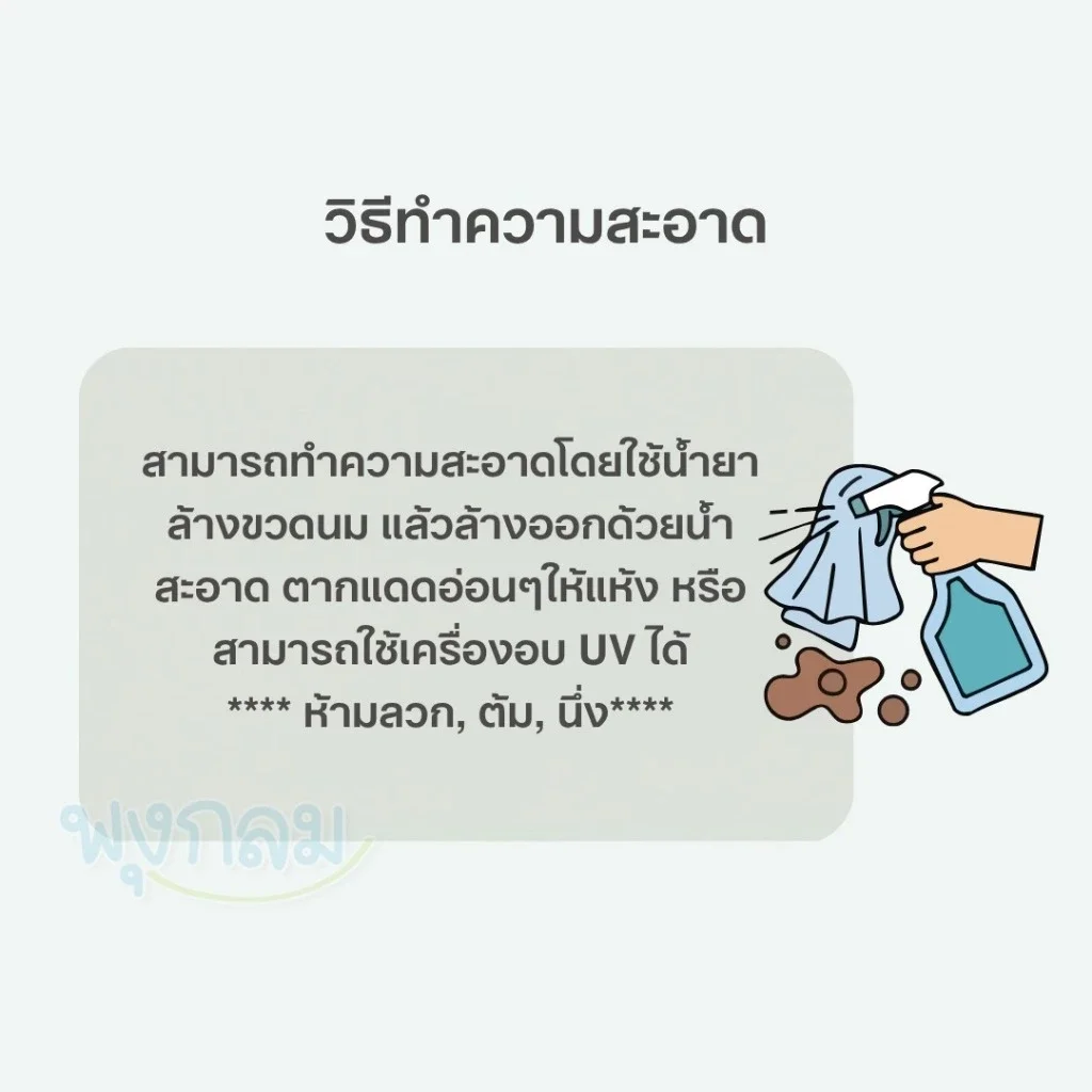 • ล้างด้วยน้ำยาล้างขวดนม แล้วล้างออกด้วยน้ำสะอาด